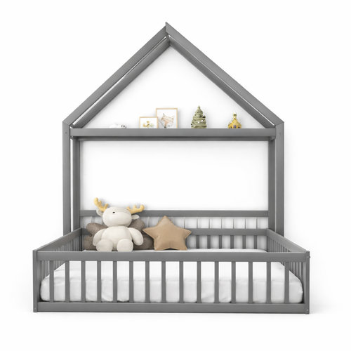 Lit cabane enfant 90X200 - Structure en bois gris ou blanc